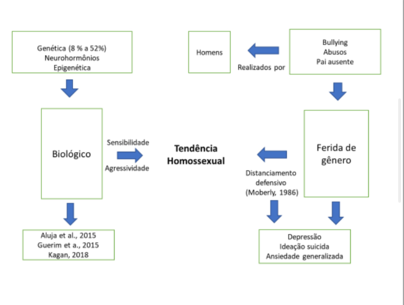 Meninos mais agressivos e com uma personalidade mais desinibida poderiam enfrentar situações de abuso e estresse de uma forma menos traumática, uma vez que reagem com mais veemência contra o agressor, não permitindo serem feridos de maneira contínua. Portanto, a gênese da homossexualidade seria ocasionada pela interação de dois fatores principais: fatores biológicos, que contribuiriam para um temperamento mais ou menos reativo herdado pelo menino (Kagan, 2018) bem como uma personalidade mais ou menos agressiva (Aluja et al., 2015), e a ferida de gênero, que se caracteriza por ser um trauma causado principalmente por figuras masculinas significativas, como pai e amigos. Esta ferida levaria o menino ao isolamento defensivo.